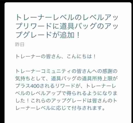 TL36の者なんですが、今朝起きたら475だったはずのアイテムボックスが600まで拡張されていました。ポケコインやポケモンボックスは全く変わってないのにです。これはアップデートか何かなんでしょうか?